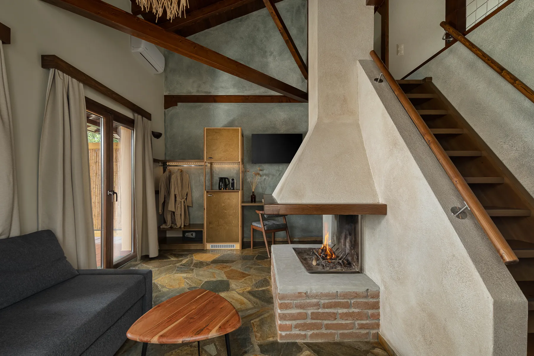 One of the standout features of this hotel is the outdoor fireplace, providing a cozy gathering spot for guests during the cold winter nights. The warmth of the fire, combined with the crisp forest air, creates a magical ambiance that encourages relaxation and connection with nature. Inside, the use of natural materials and earthy tones continues, offering a comfortable and elegant retreat for guests to unwind.